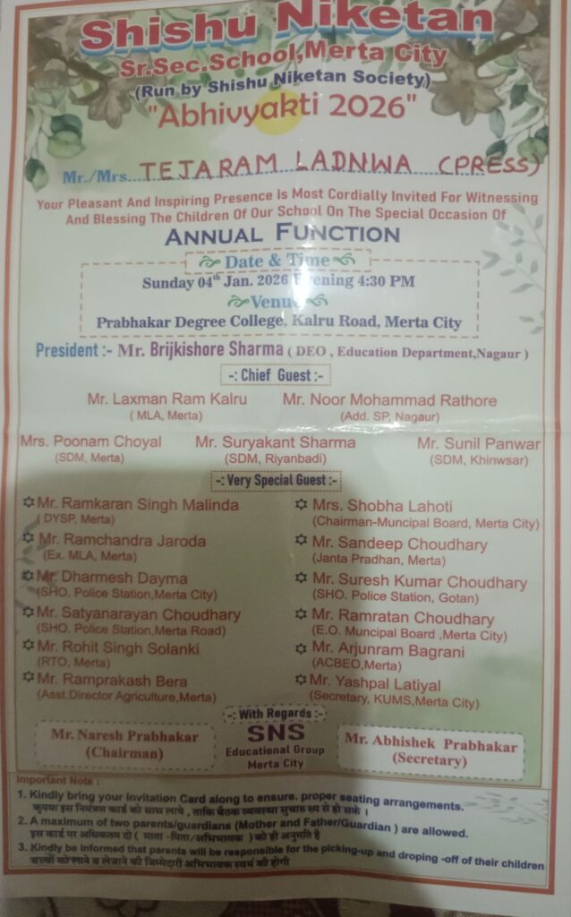 शिक्षा के साथ संस्कार और सृजनात्मकता को समर्पित शिशु निकेतन सीनियर सेकेंडरी स्कूल, मेड़ता सिटी (शिशु निकेतन सोसायटी द्वारा संचालित) का बहुप्रतीक्षित वार्षिक समारोह ‘अभिव्यक्ति–2026’ आगामी रविवार, 4 जनवरी 2026 को सायं 4:30 बजे भव्य रूप से आयोजित किया जाएगा। आयोजन प्रभाकर डिग्री कॉलेज, कालरू रोड, मेड़ता सिटी में होगा, जहां विद्यार्थियों की प्रतिभा राष्ट्रीय सोच और समकालीन विषयों के साथ मंच पर साकार होगी।