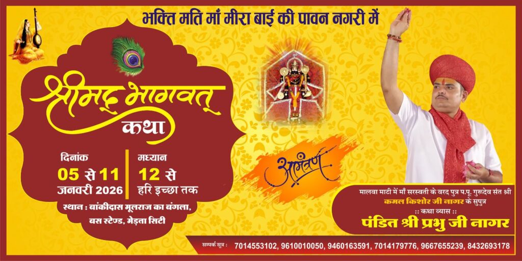 मेड़ता सिटी तेजाराम लाडणवा ऐतिहासिक मीरां नगरी मेड़ता सिटी की पावन धरा पर आध्यात्मिक चेतना का अद्भुत संगम देखने को मिलेगा। नगर में पंडित श्री प्रभुजी नागर के श्रीमुख से श्रीमद् भागवत कथा का भव्य आयोजन किया जा रहा है, जिसे लेकर धर्मप्रेमी श्रद्धालुओं में खासा उत्साह देखा जा रहा है।