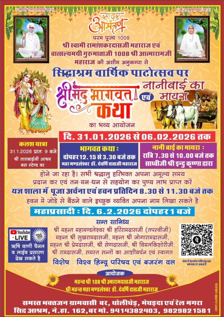 सिद्धाश्रम में 31 जनवरी से 6 फरवरी तक आयोजित होने वाले वार्षिक पाटोत्सव में इस बार धार्मिक व सांस्कृतिक माहौल विशेष रूप से गहराने वाला है। आयोजन में श्रीमद्भागवत कथा व नानीबाई का मायरा का पाठ भव्य स्वरूप में होगा, जिसमें मेड़ता की लाड़ली बेटी साध्वी इन्दु कृष्ण जी तथा राष्ट्रव्यापी ख्याति प्राप्त महा मंडलेश्वर डॉ. देवर्षि दासजी महाराज मुख्य केंद्र में रहेंगे।