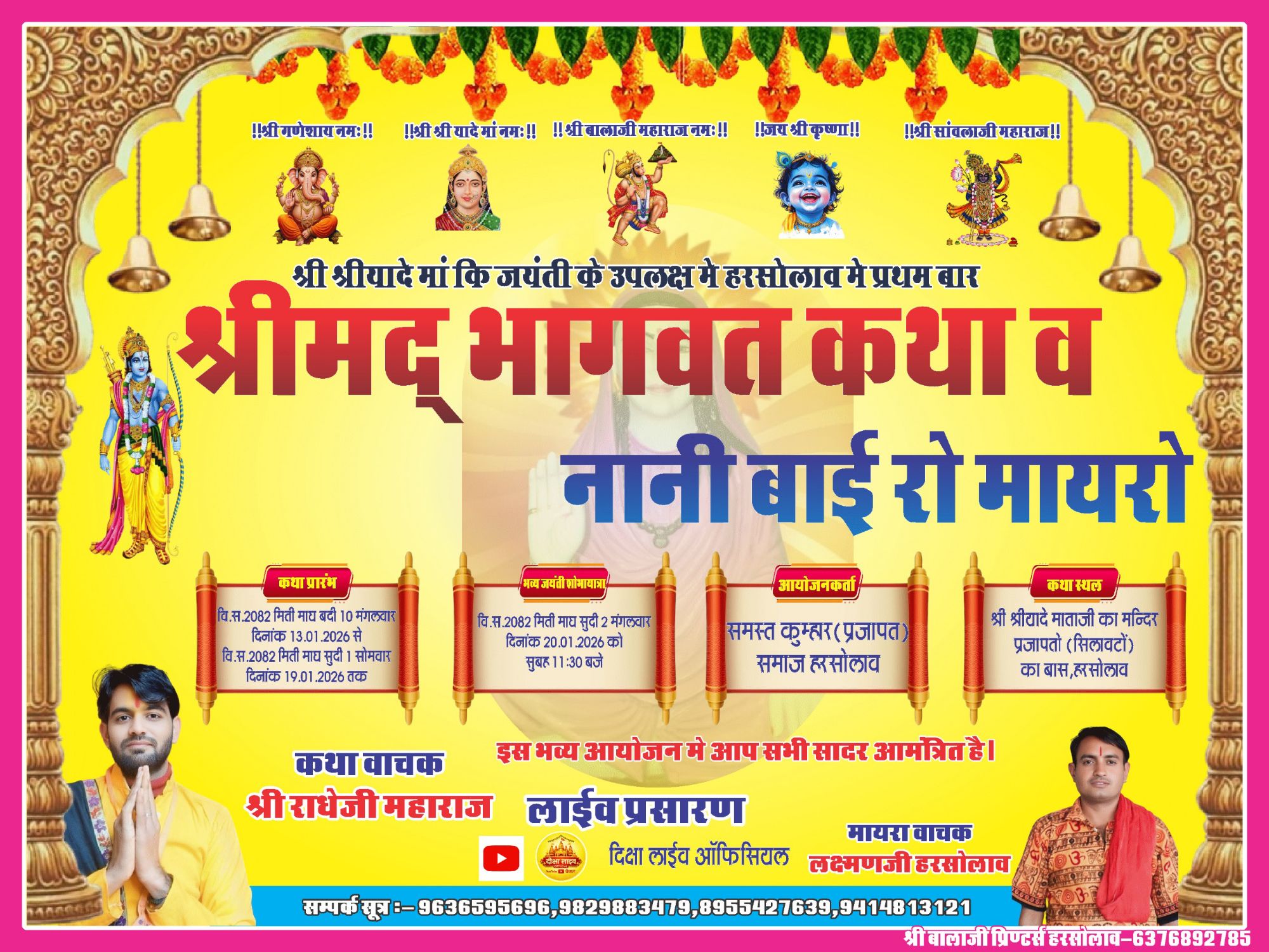 भक्त शिरोमणि श्री श्रीयादे माता प्रजापति की जन्म जयंती के शुभ अवसर पर समस्त प्रजापति समाज, हरसोलाव द्वारा श्रीमद् भागवत कथा एवं ‘नानी बाई रो मायरो’ का भव्य आयोजन किया जा रहा है। यह आयोजन श्रद्धा, आस्था और संस्कारों का जीवंत संगम बनेगा, जहां हर हृदय भक्ति के रस में डूब जाएगा।