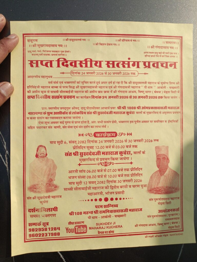 आयोजकों ने मेड़ता क्षेत्र सहित आसपास के सभी गांवों के धर्मप्रेमी जनों से हृदय से आग्रह किया है कि वे सपरिवार पधारकर इस पुण्य महोत्सव के साक्षी बनें। यह अवसर केवल सुनने का नहीं, बल्कि स्वयं को प्रभु भक्ति में समर्पित करने का है।