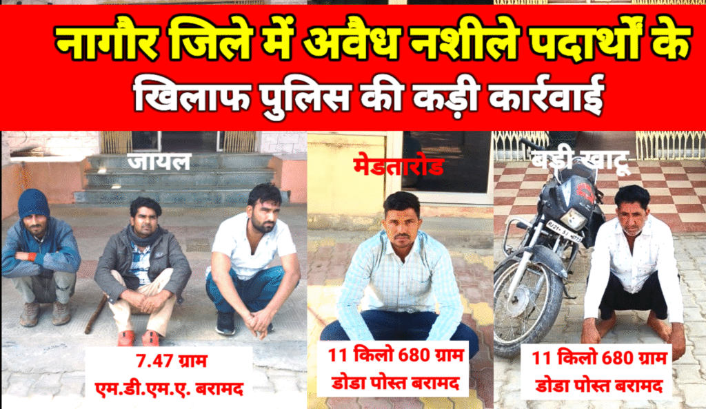 मेड़ता रोड। नागौर जिले में अवैध मादक पदार्थों की रोकथाम एवं व्यापार में संलिप्त अपराधियों पर नकेल कसने के उद्देश्य से जिला पुलिस अधीक्षक श्री मृदुल कच्छावा (IPS) के मार्गदर्शन में चल रहा ‘ऑपरेशन नीलकंठ’ लगातार परिणाम दे रहा है। बीते दिन जिले के विभिन्न थाना क्षेत्रों में पुलिस ने समन्वित कार्रवाई करते हुए बड़ी मात्रा में मादक पदार्थ बरामद कर कई आरोपियों को गिरफ्तार किया है।
