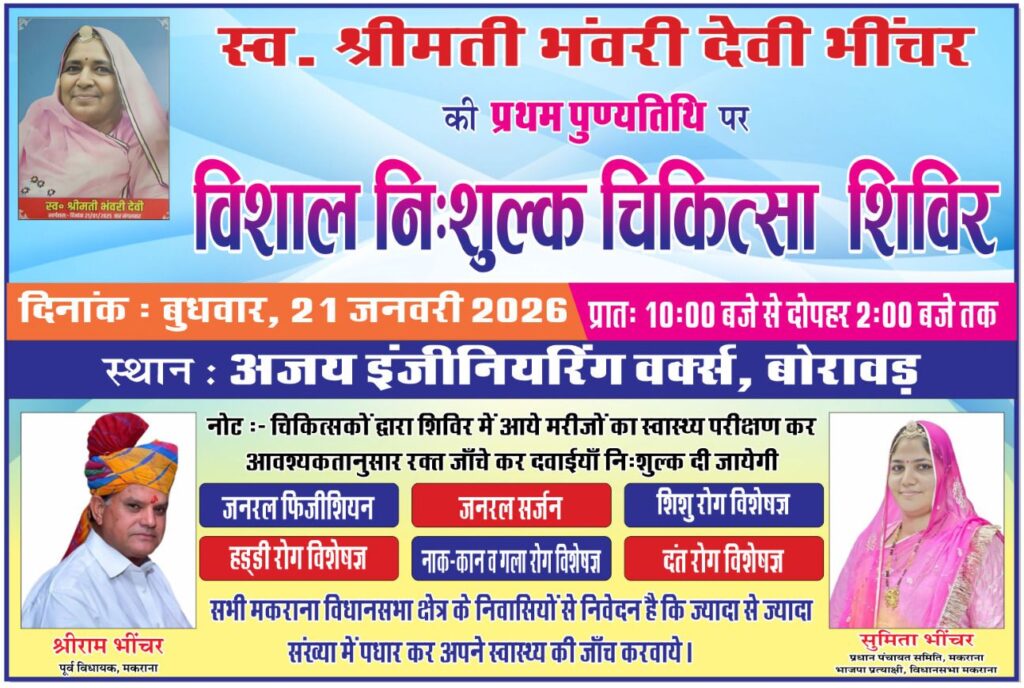 स्व. श्रीमती भंवरी देवी भींचर की प्रथम पुण्यतिथि के अवसर पर आगामी 21 जनवरी को बोरावड़ स्थित अजय इंजीनियरिंग वर्क्स परिसर में विशाल निःशुल्क चिकित्सा शिविर का आयोजन किया जाएगा। रविवार को मकराना प्रधान सुमिता भींचर ने शिविर के पोस्टर का विमोचन कर कार्यक्रम की औपचारिक घोषणा की।