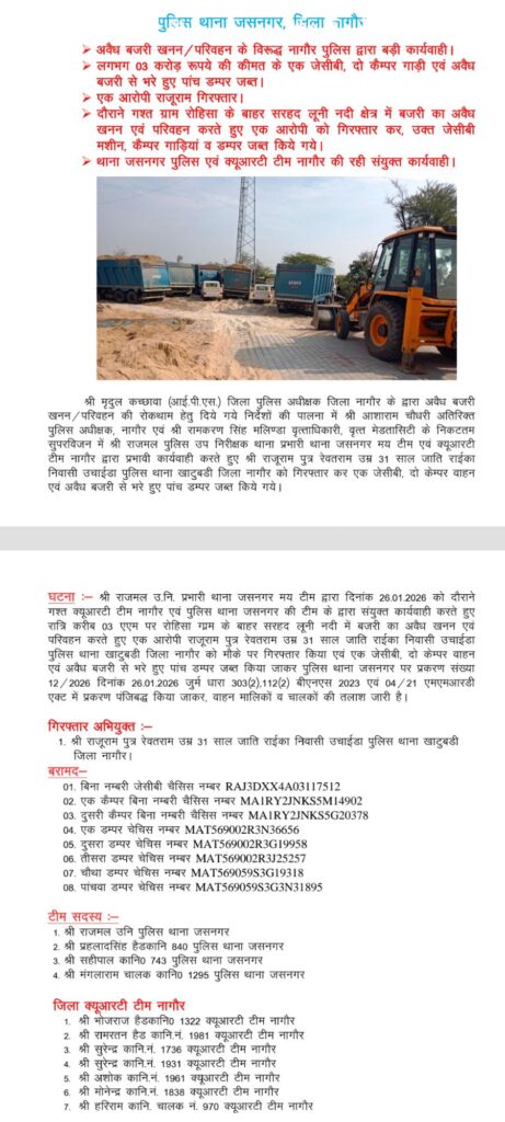 जब्त वाहनों में एक जेसीबी व पांच डम्परों के साथ दो कैम्पर वाहन शामिल हैं। बरामद वाहनों की कीमत लगभग तीन करोड़ रुपये आंकी गई है। पुलिस ने थाना जसनगर पर प्रकरण संख्या 12/2026 दिनांक 26.01.2026 को धारा 303(2), 112(2) बीएनएस 2023 एवं 4/21 एमएमआरडी एक्ट में दर्ज किया है। वाहन मालिकों व चालकों की तलाश जारी है।
