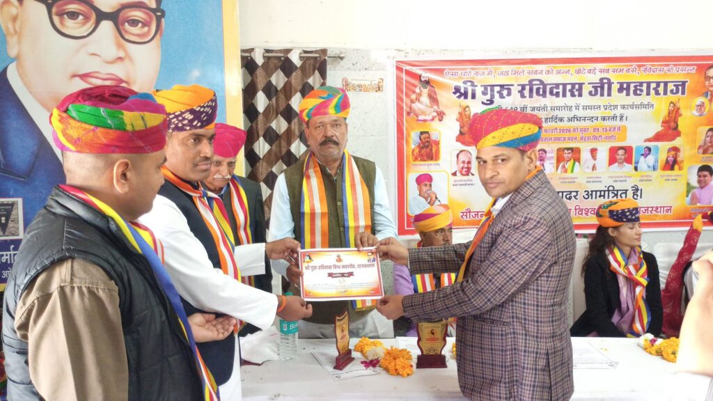मीरा नगरी मेड़ता सिटी में संत शिरोमणि गुरु रविदास जी महाराज की 649वीं जन्म जयंती के पावन अवसर पर मेघवाल छात्रावास परिसर में प्रदेश स्तरीय विचार गोष्ठी, जयंती समारोह एवं श्री गुरु रविदास विश्व महापीठ राजस्थान की प्रदेश कार्य समिति बैठक का भव्य आयोजन किया गया। आयोजन पूरी तरह धार्मिक, आध्यात्मिक एवं सामाजिक समरसता के भाव से ओत-प्रोत रहा, जिसमें विभिन्न समाजों के श्रद्धालुओं ने बढ़-चढ़कर भाग लिया।