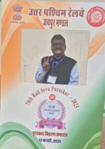 फुलेरा(दामोदर कुमावत)उत्तर पश्चिम रेलवे के जयपुर मंडल पर 70वां रेल सेवा पुरस्कार समारोह गुरुवार12 फरवरी 2026 को “अरावली क्लब” गणपति नगर रेलवे कॉलोनी जयपुर में मनाया गया। जिसमें मंडल रेल प्रबंधक रवि जैन द्वारा दीप प्रज्जवलित कर कार्यक्रम की शुरुआत की गई।
