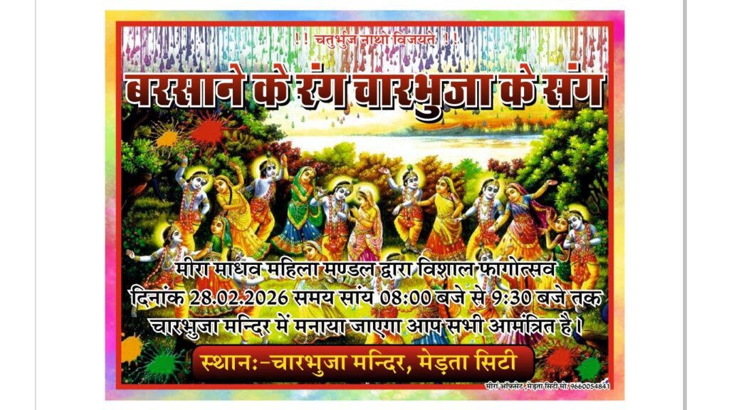 मेड़ता सिटी। फागुन माह के पावन अवसर पर शहर में आज शाम भक्ति और उल्लास से सराबोर फागोत्सव का आयोजन होगा। ऐतिहासिक चारभुजा नाथ मंदिर एवं मीराबाई मंदिर में ठाकुर जी के साथ इत्र और फूलों की होली खेली जाएगी।