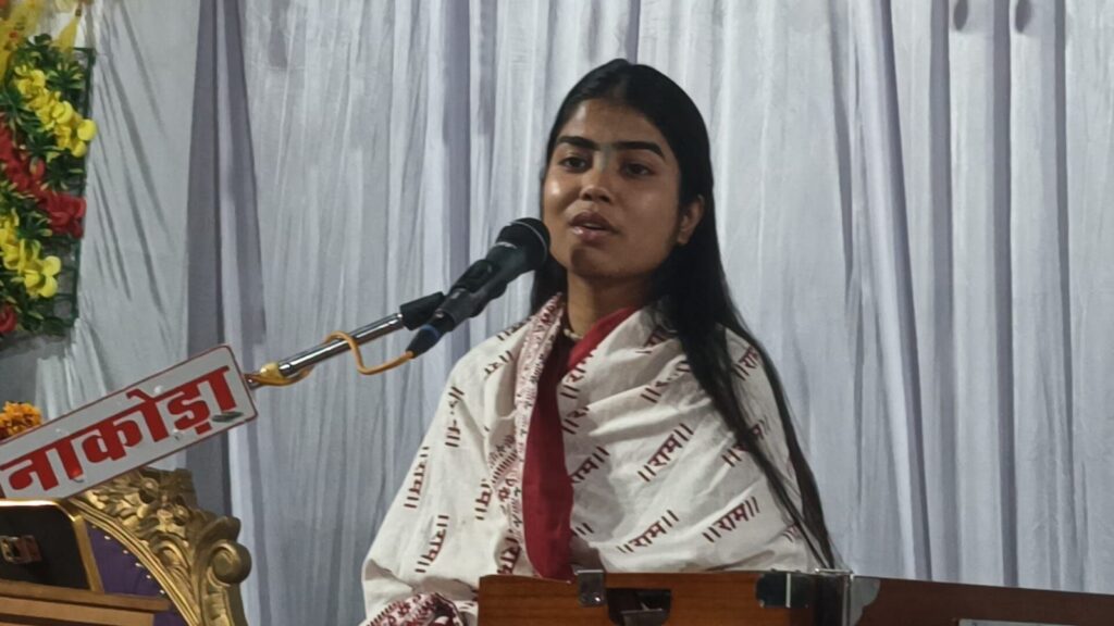 कथा मे नानी बाई के मायरे प्रसंग में नरसी महाराज को भगवान कृष्ण का स्वरूप दर्शन कराया गया मायरा वाचिका साध्वी मनथा श्री ने अपने मधुर वाणी से भजनों का रस पान कराकर भक्तों को आत्म विभोर किया