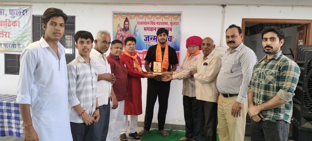 फुलेरा(दामोदर कुमावत) कस्बे के जोबनेर रोड स्थित विप्र वाटिका में रविवार को भगवान परशुराम का जन्मोत्सव बड़ी धूम-धाम,विधि, विधान एवं पूजा अर्चना के साथ मनाया गया। विप्र महासभा शाखा के अध्यक्ष राजू दाधीच की अध्यक्षता में आयोजित परशुराम जन्मोत्सव कार्यक्रम में गायत्री माता, दधीचि ऋषि एवं भगवान परशुराम की विशेष पूजा अर्चना कर उपस्थित समाज के महिला – पुरुषों ने महा आरती कर नगर एवं क्षेत्र में शांति एवं प्रगति की कामना की।