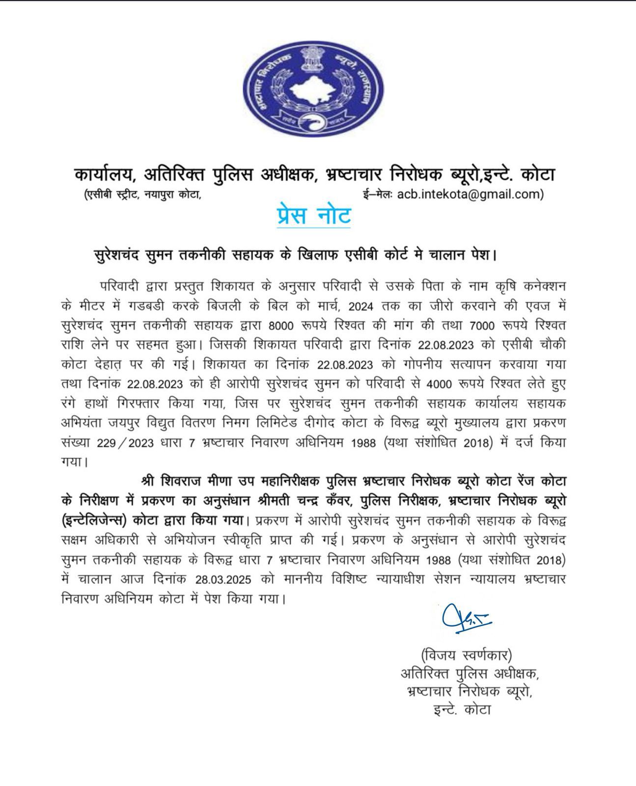 जालोर में कनिष्ठ अभियंता रिश्वत लेते रंगे हाथों गिरफ्तारजोधपुर डिस्कॉम के कनिष्ठ अभियंता अंकित तिवारी को 7000 रुपये रिश्वत लेते हुए गिरफ्तार किया गयाभ्रष्टाचार निरोधक ब्यूरो ने की कार्रवाई, आरोपी के खिलाफ मामला दर्ज March 29, 2025 No Comments