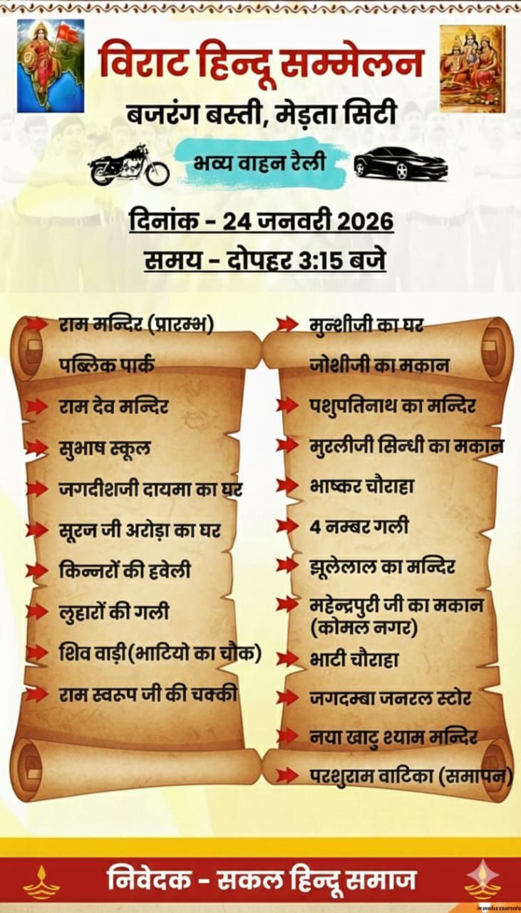 हिंदू एकता का महाकुंभ: मेड़ता सिटी में विराट हिंदू सम्मेलन से पहले गूंजेगा जन-जन का जयघोषबजरंग बस्ती से निकलेगी ऐतिहासिक वाहन रैली, शहर की हर गली बनेगी आस्था की साक्षी January 23, 2026 No Comments