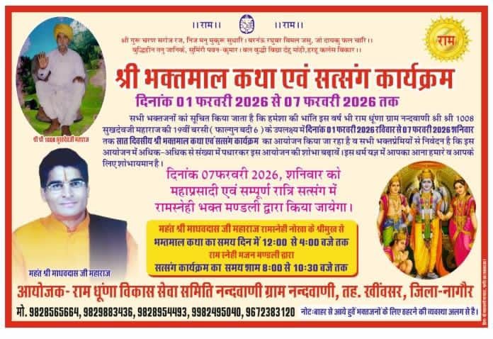 भक्तमाल कथा में उमड़ेगा श्रद्धा का सागर, नागौर की धरती पर सात दिवसीय आध्यात्मिक महोत्सव January 31, 2026 No Comments