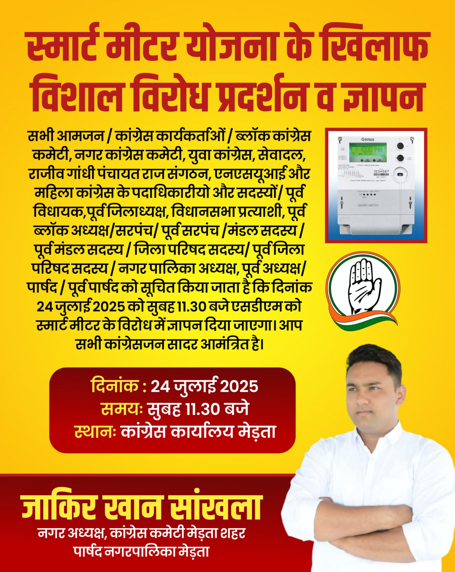 स्मार्ट मीटर के खिलाफ मेड़ता में आज कांग्रेस का हल्ला बोल , SDM को सौंपा जाएगा ज्ञापन July 18, 2025 No Comments