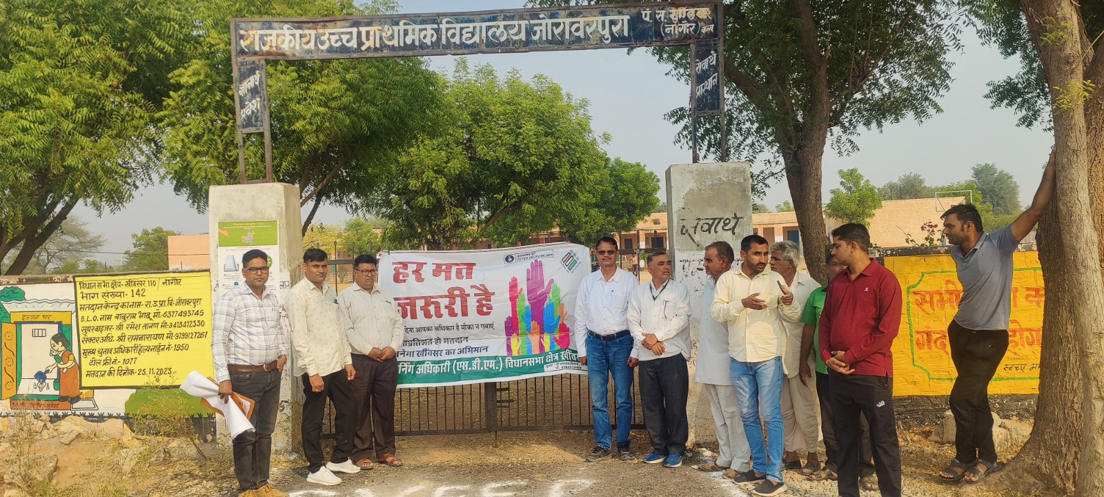 स्वीप टीम द्वारा खींवसर विधानसभा के ग्राम जोरावरपुरा, चरड़ा एवं भावण्डा में सतरंगी सप्ताह कार्यक्रम के तहत आज की थीम ‘‘अंगुली पर स्याही का निशान राष्ट्र के नाम‘‘ का आयोजन किया गया November 17, 2023 No Comments