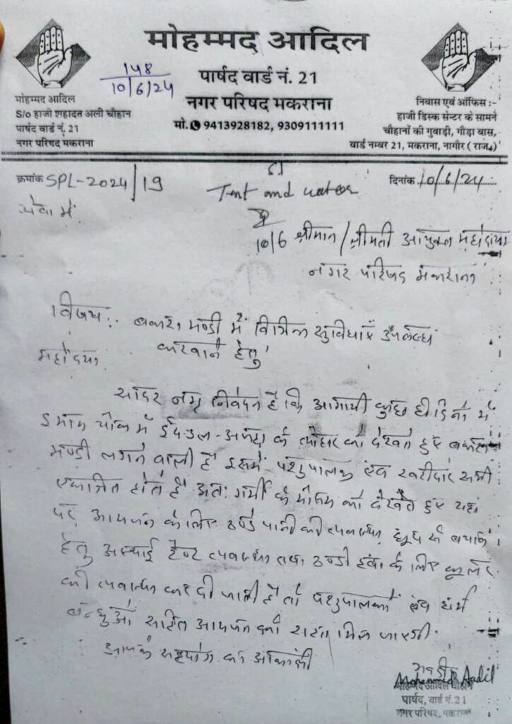 पार्षद ने आयुक्त से की बकरा मंडी में अस्थाई टेंट और पानी की व्यवस्था करने की मांग June 10, 2024 No Comments