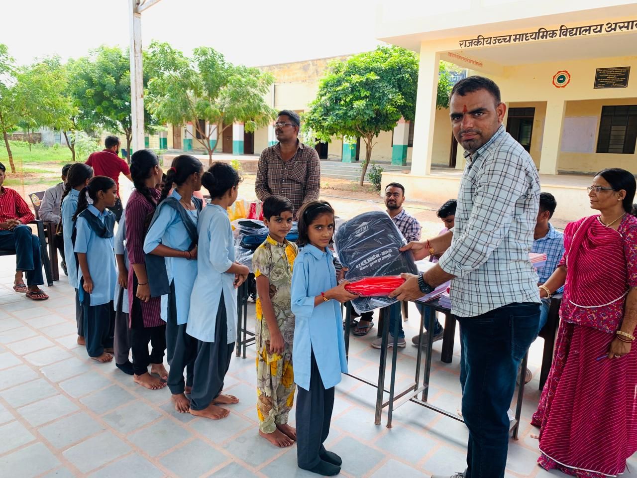 स्कूल बैग पाकर बालिकाओं के चेहरे खिले