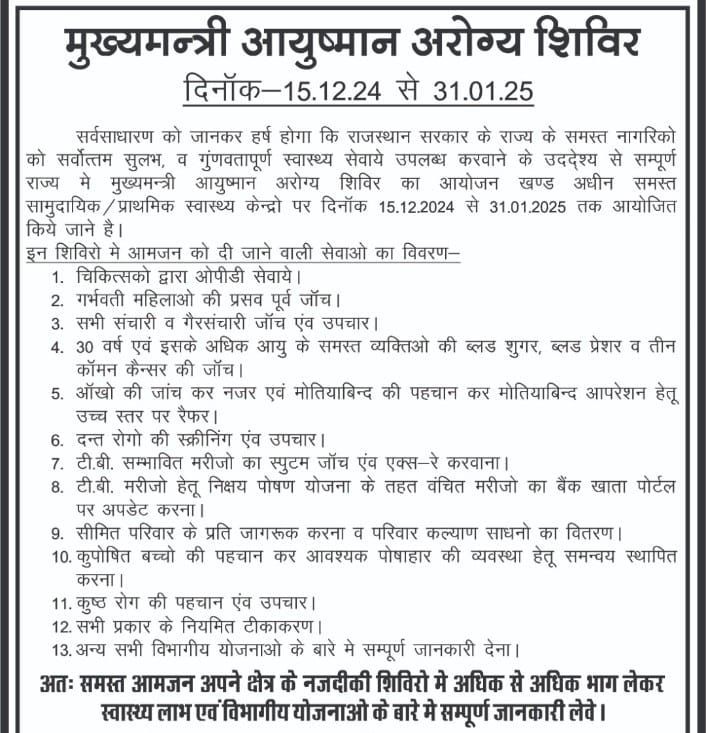 आयुष्मान आरोग्य शिविर का आयोजन होगा आज